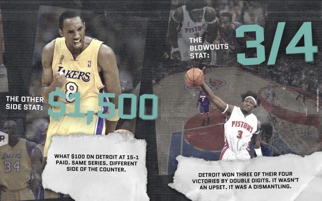 On the other side of that counter sat Detroit at 15-1. $100 on the Pistons paid $1,500. Same series. Same games. Completely different universe of return depending on which side of the line you were standing on.