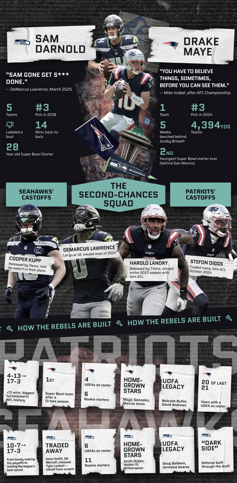 They called them castoffs. Retreads. Never coulda bes. Rebels. Second chances rarely work out. But Sam Darnold or Drake Maye are one win away from proving everyone wrong.